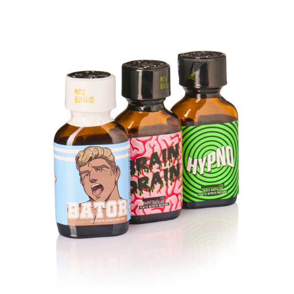 Twisted Beast Poppers Combo se compose de trois flacons de poppers Twisted Beast : Bator Poppers 24ml Twisted Beast, Brain Drain Poppers 24ml Twisted Beast et Hypno Poppers 24ml Twisted Beast.
