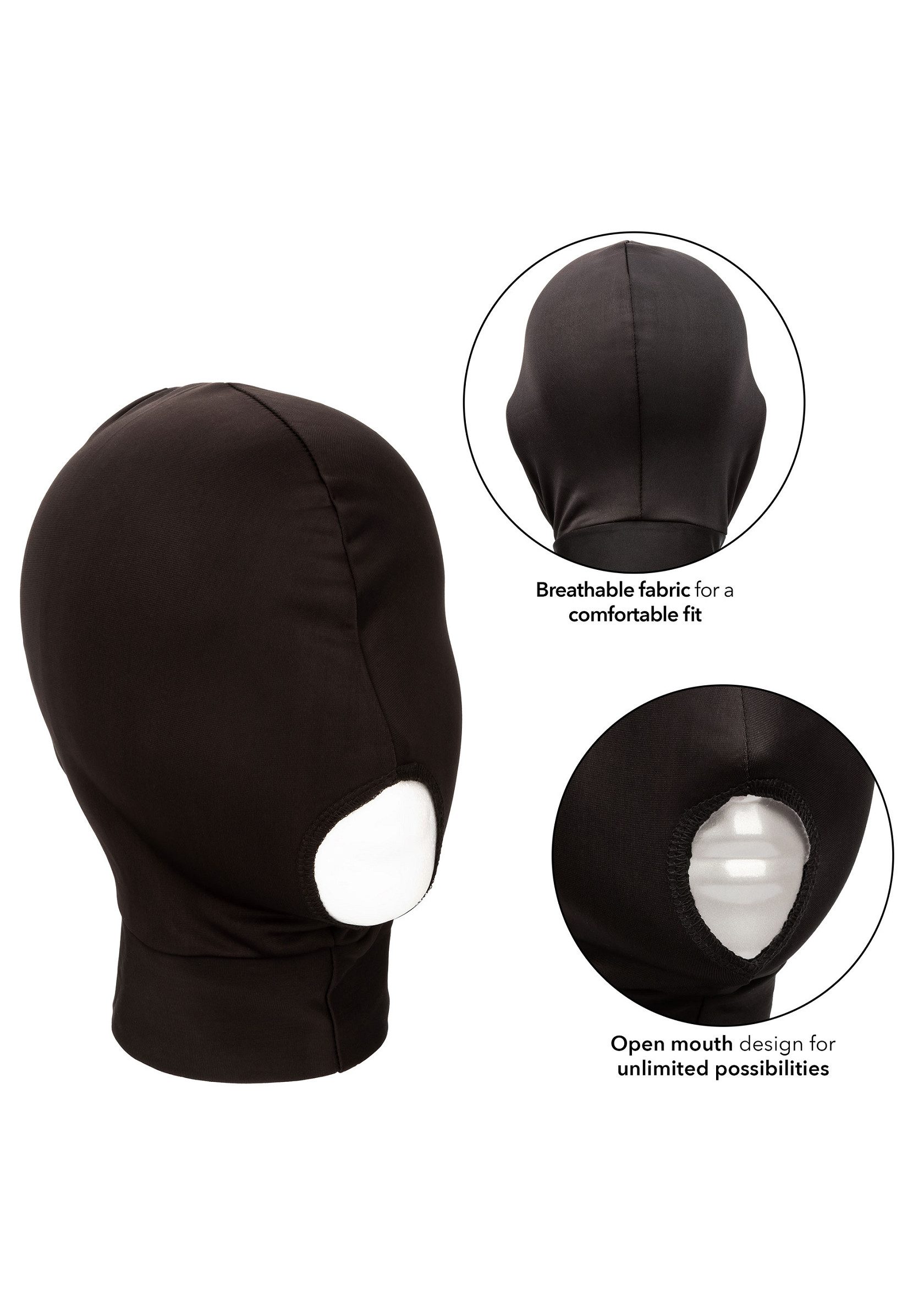 Die CalExotics Maske mit Mundöffnung ist perfekt für Paare, die mit sensorischem Spiel experimentieren und aufregende erotische Abenteuer erleben möchten. Erweitere die Grenzen deiner Lust mit dieser kühnen Kapuze, die aus atmungsaktivem Stoff besteht, eine dehnbare Passform bietet und die Sicht einschränkt.