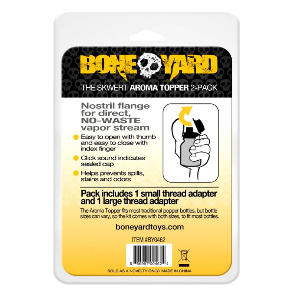 Der Poppers Aroma Topper ist ein Flip Top aus ABS-Kunststoff, mit dem sich Aromaflaschen mit einer Hand öffnen und schliessen lassen. Es gibt ihn in zwei Grössen, klein und gross, und er passt auf die meisten Marken von Poppers auf dem Markt.