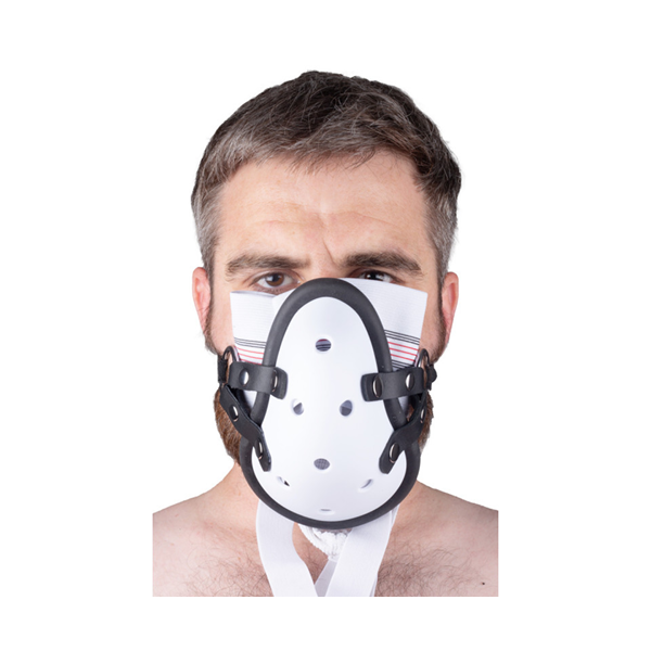 Die Maske misst ca. 16 × 11 cm und lässt sich mit stabilen, verstellbaren Gurten (45–58 cm) individuell anpassen – für einen sicheren und bequemen Sitz bei jeder Session.